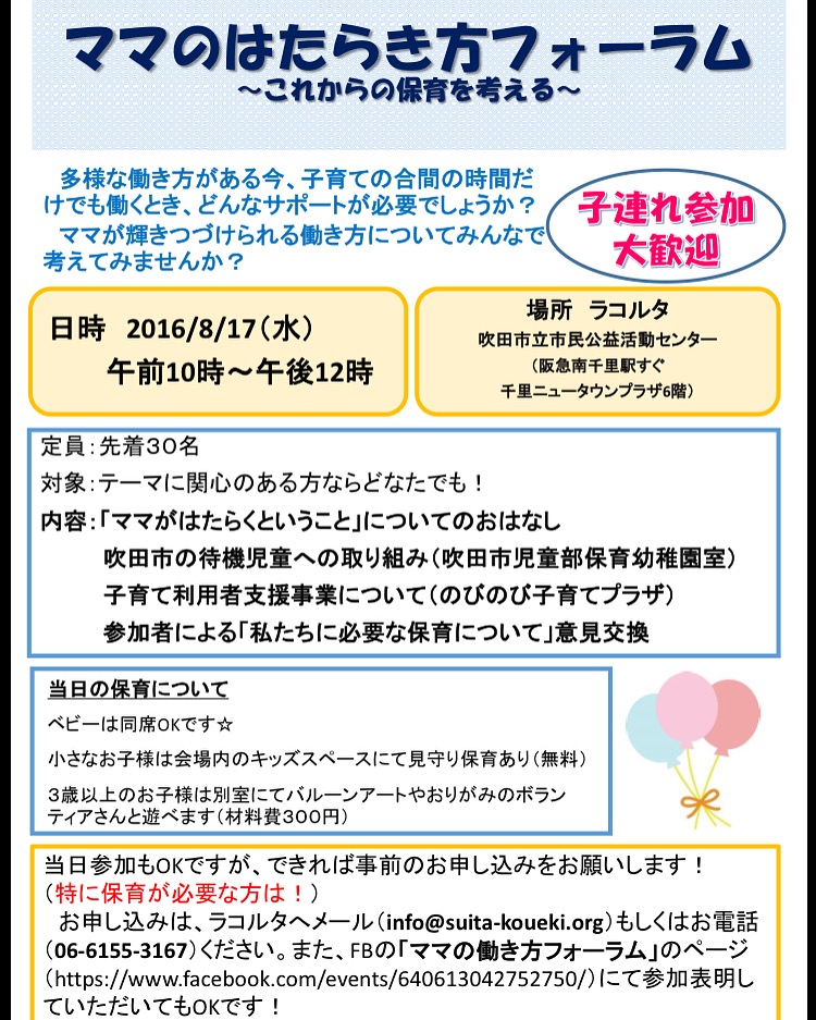 少し遅れましたが… 17日に行いました『ママの働き方フォーラム』 はじめはお盆ということもあり、10人くらいしか集まらない予定でしたが、なんだかんだみなさん来ていいただき、20名参加いただきました🎶 ラコルタセンター長の柳瀬さんのお話も興... -