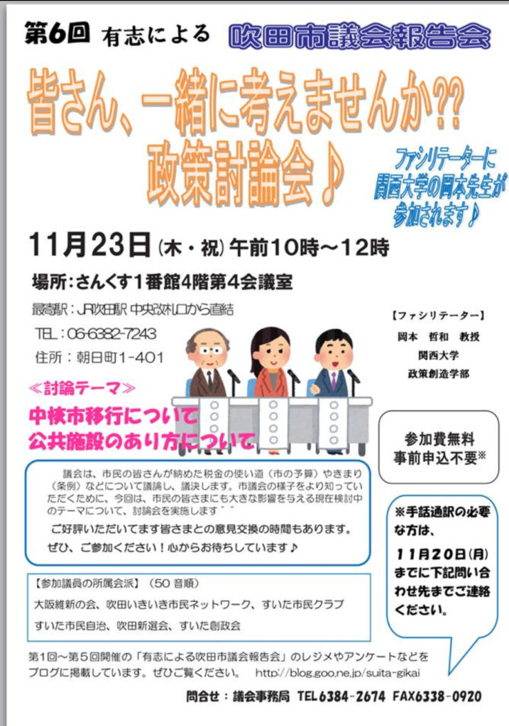 今回は、はじめての討論会形式で、市民の皆さんと一緒に吹田市政の政策課題について考えていきたいと思っています。