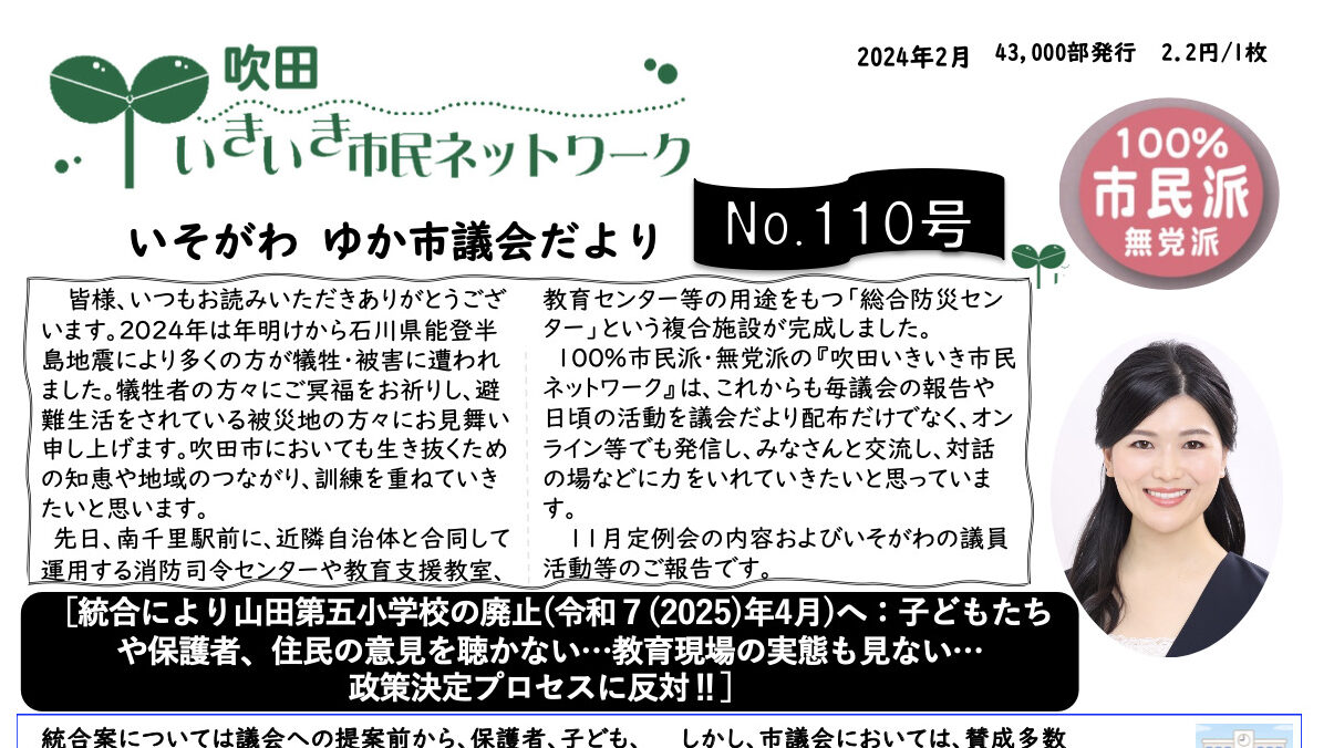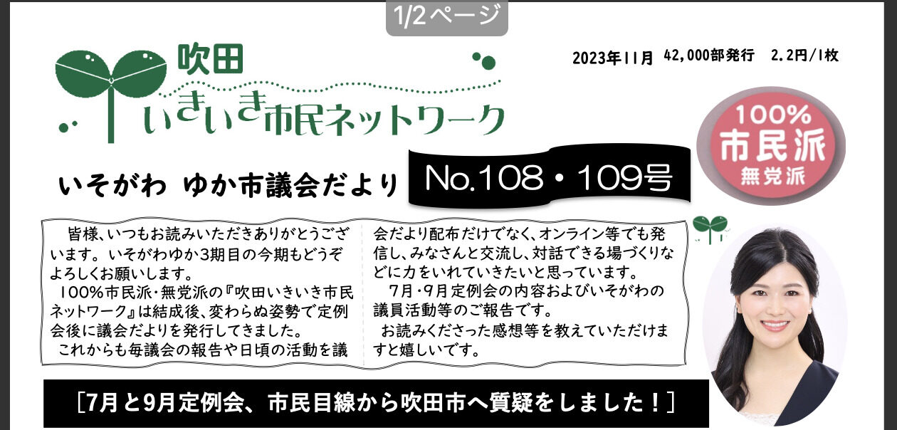 1995年1月に、市民の声で市政を変えよう!と『吹田いきいき市民ネットワーク』は結成して、 2025年で30年を迎えました! 私たちはこれまで、「市民のための市政」を大切にしながら、世代をこえて多くの方々とつながりながら […]